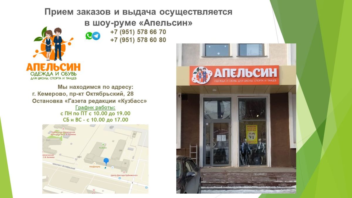 3. г. Кемерово, пр-кт Октябрьский, дом 28 - шоу-рум "АПЕЛЬСИН" (вход с улицы, отдельное крыльцо)
