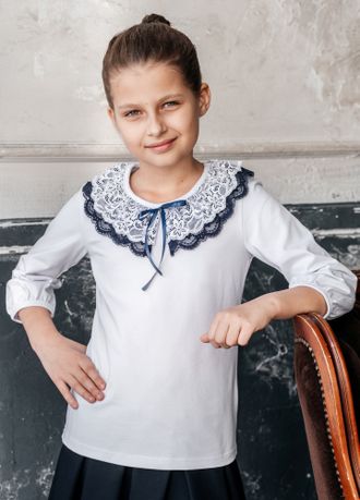 Блузка трикотажная, с кружевом в два слоя по горловине и атласной лентой.