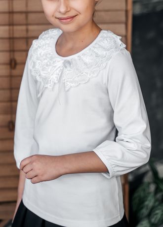 Блузка трикотажная, с кружевом в два слоя по горловине и атласной лентой.