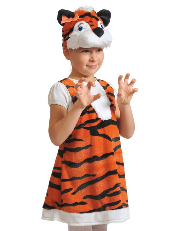 В комплект входит сарафан и шапочка-маска, расцветка которых имитирует тигриную шкуру, низ сарафана и шапочка декорированы вставками из плюша.