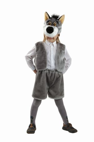 Карнавальный костюм ВОЛКА в комплекте (Жилетка серая без застежек, шорты на резинке, шапка с набивной мордочкой волка, глазами и ушками)