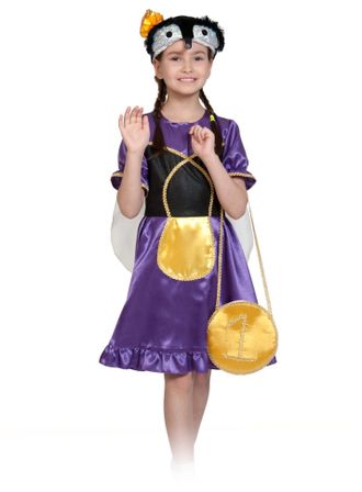 Костюм включает в себя фиолетовое атласное платье с имитацией фартучка и вставкой из черной ткани.