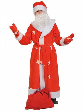 Он сшит из мягкого красного плюша и состоит из длинной шубы со звездами, рукавиц, пояса и, конечно же, бороды.