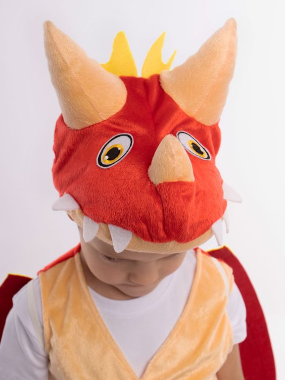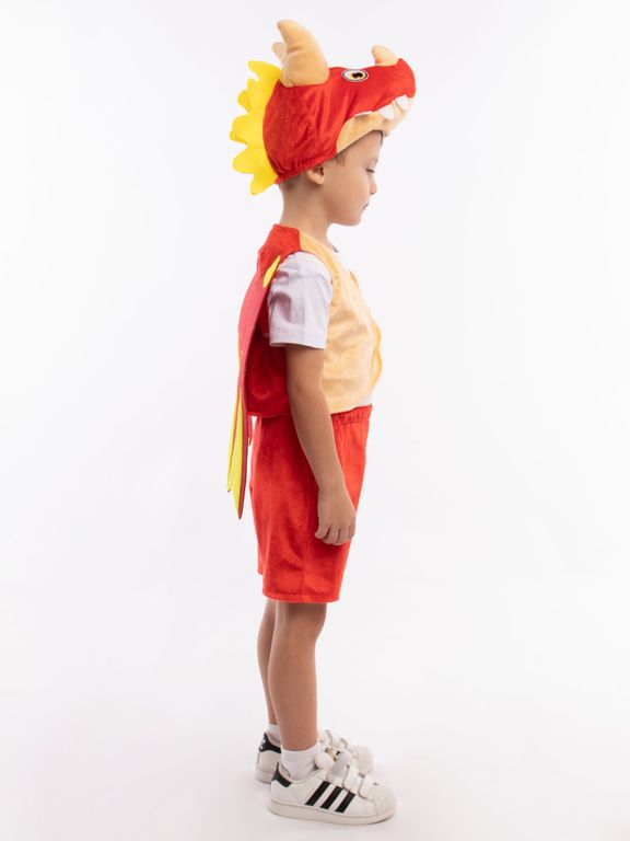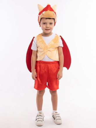 Карнавальный костюм Дракоша детский: жилет на велькро, шорты на резинке, крылья фетровые на резинке.