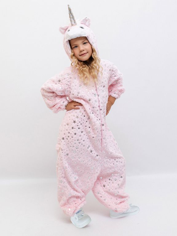 Костюм кигуруми Единорог для девочек розовый из плюша с серебряными звездочками.