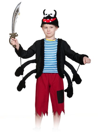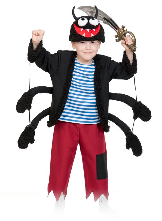 Костюм Злодея Паука состоит из черного сюртука-пиджачка, отороченного искусственным мехом, с длинными рукавами и паучьими лапками, которые соединены тесемкой, имитирующей паутинки.