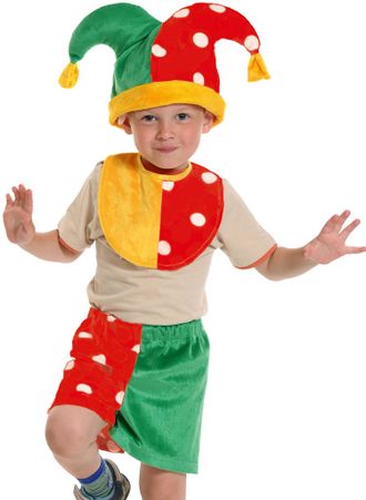 В костюме веселого скомороха ребенок будет выглядеть нарядно и празднично на новогоднем утреннике.
