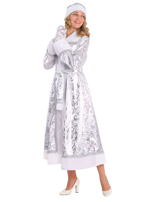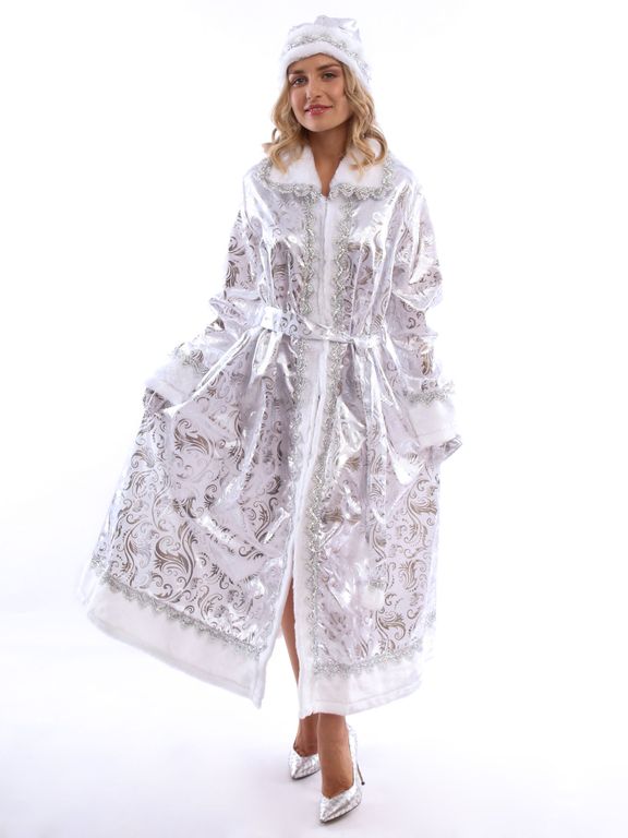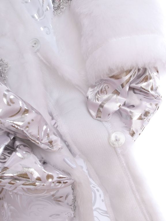 - Оторочка белым искусственным мехом рукавов, воротника и подола