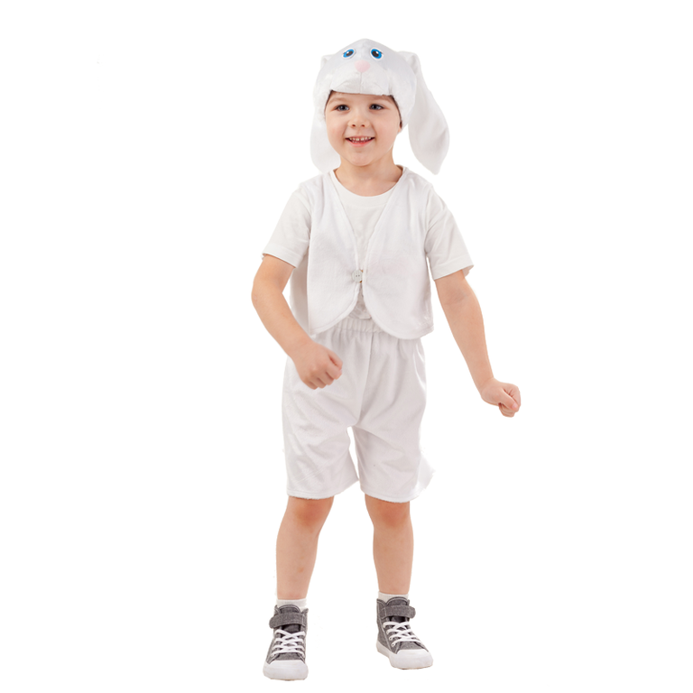 Карнавальный костюм ЗАЯЦ БЕЛЫЙ ВАНЯ в комплекте (Жилетка с застежкой на пуговицу, Шорты на резинке с хвостиком сзади, Маска-шапка белого цвета с длинными ушками, глазками и носиком)