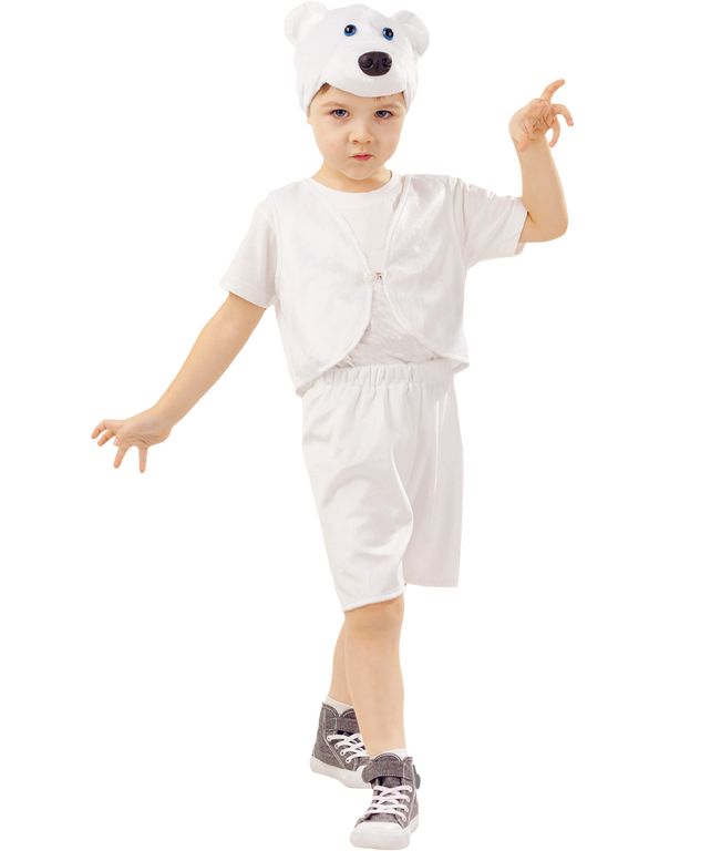 Карнавальный костюм МЕДВЕДЬ БЕЛЫЙ УМКА в комплекте (Жилетка застегивается спереди на пуговицу, шортики короткие на резинке, шапка с набивным носом, глазками и ушками)