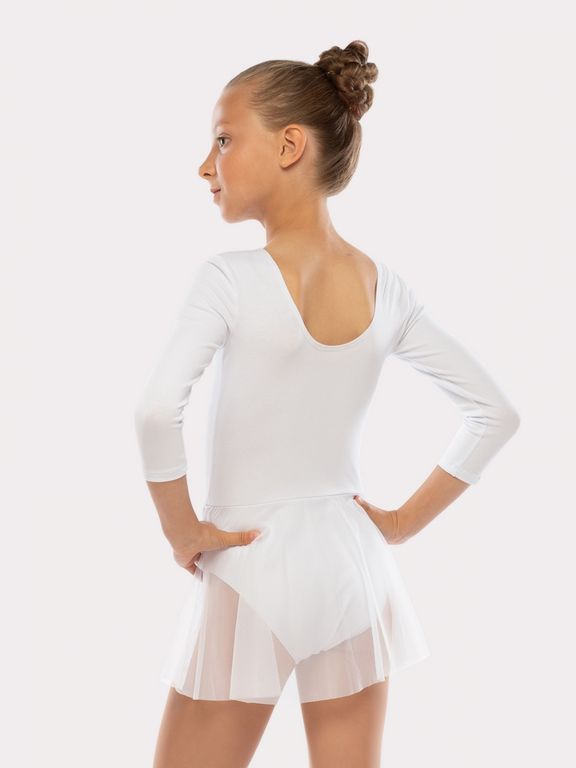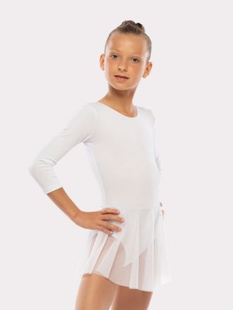 Гимнастический купальник с рукавом 3/4, глубоким вырезом на спине и юбкой-сеткой.