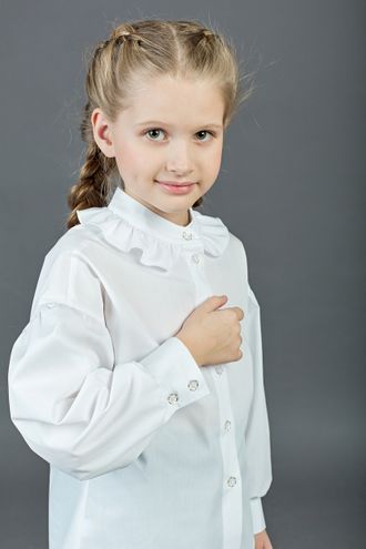 Белая блузка прямого силуэта с заниженной линией плеча.