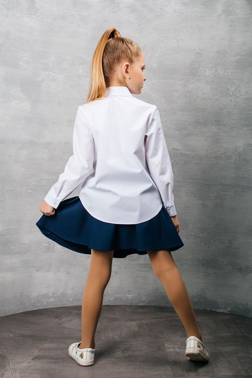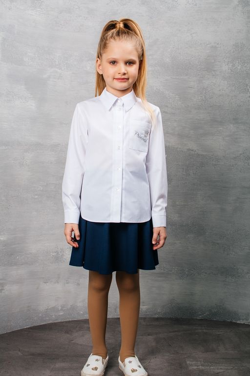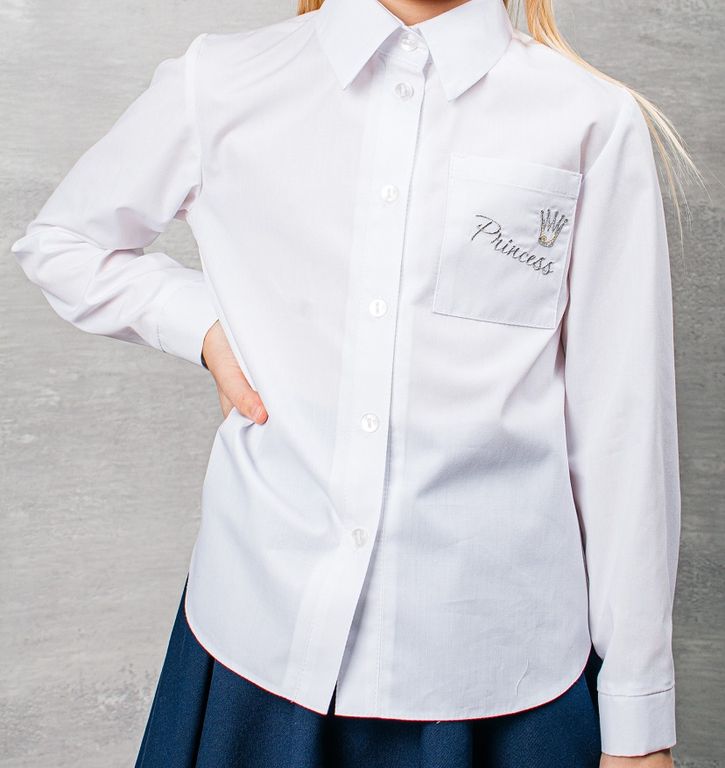 Белая блузка прямого силуэта с овальным низом.