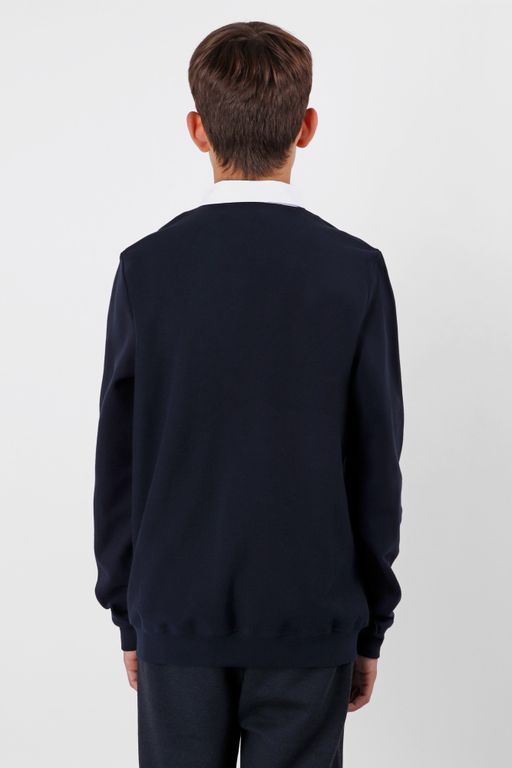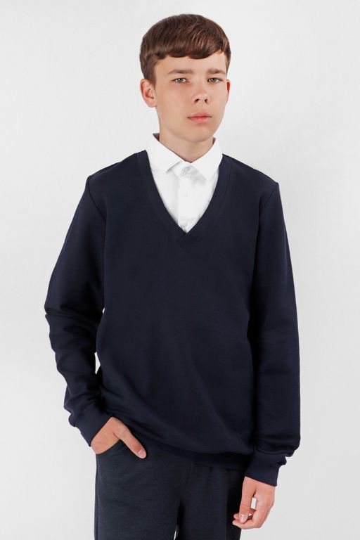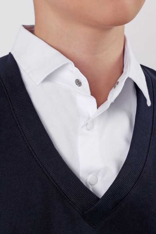 Школьный джемпер-обманка для мальчика оптом с имитацией рубашки выполнен из качественного хлопкового трикотажа.