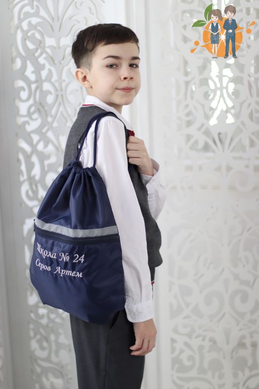 Сумка для сменной обуви или спортивной одежды с вышивкой номера школы и фамилией, именем ребенка.