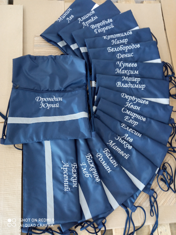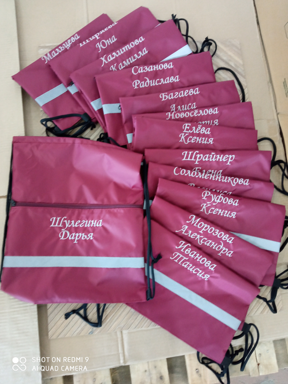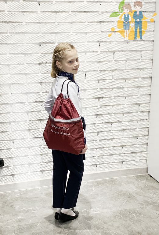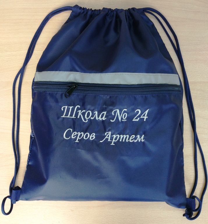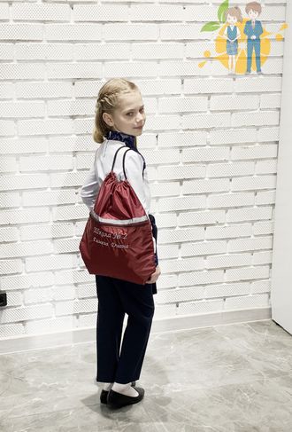 Сумка для сменной обуви или спортивной одежды с вышивкой номера школы и фамилией, именем ребенка.