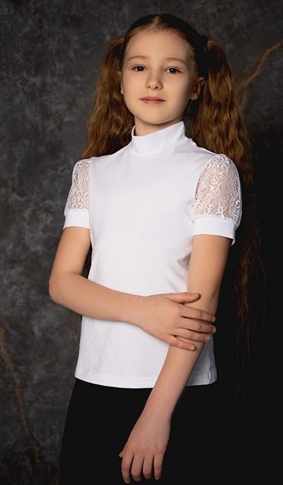 Рукав - короткий, втачной, из кружевного полотна. Воротник-стойка двойной.