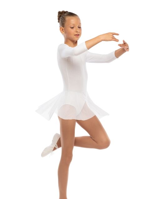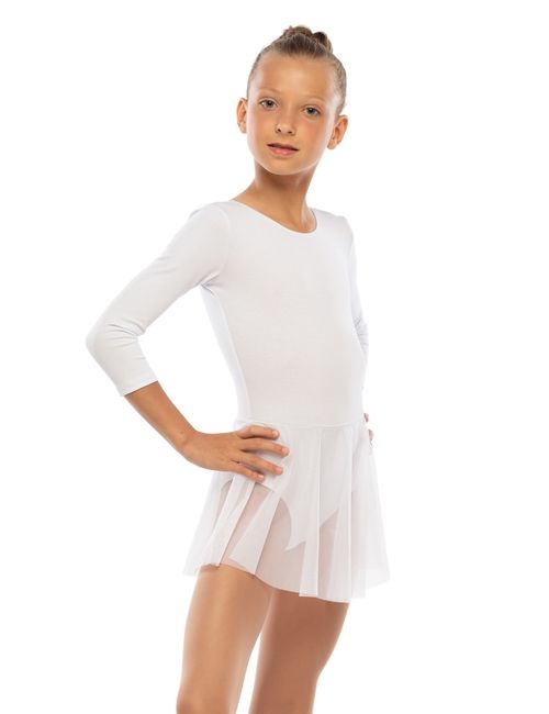 Гимнастический купальник с рукавом 3/4, глубоким вырезом на спине и юбкой-сеткой.